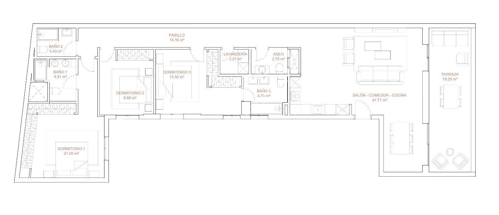 Situado en la sexta planta del edificio, sus 194 m² están distribuidos en tres dormitorios amplios con armarios empotrados —dos de ellos con baño privado en suite—, un baño completo adicional, una cocina abierta y totalmente equipada, un salón-comedor con acceso a la terraza, un aseo y una práctica zona de lavandería.