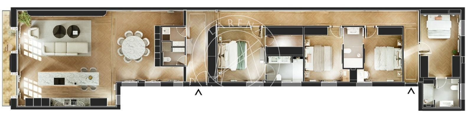 La zona de noche se distribuye en cuatro dormitorios en suite, todos ellos con armarios empotrados y baños completos. Dos de estos dormitorios comparten un baño tipo en suite doble, perfecto como área infantil o para invitados, mientras que el dormitorio principal disfruta de su propio baño y una agradable sensación de amplitud gracias a los techos de 3 metros de altura. El cuarto dormitorio, situado en una zona algo más independiente del resto, también dispone de baño en suite, lo que lo convierte en una excelente opción como habitación de invitados, despacho o cuarto de servicio.