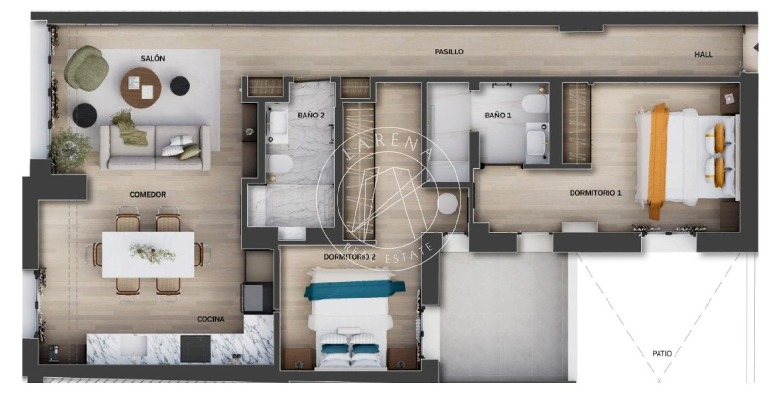 La vivienda cuenta con 98 m² construidos, distribuidos en 2 dormitorios dobles, 2 baños completos (uno de ellos en suite) y un amplio salón con la zona de comedor y la cocina integrados, creando un espacio cómodo y funcional. Se entrega totalmente amueblada.